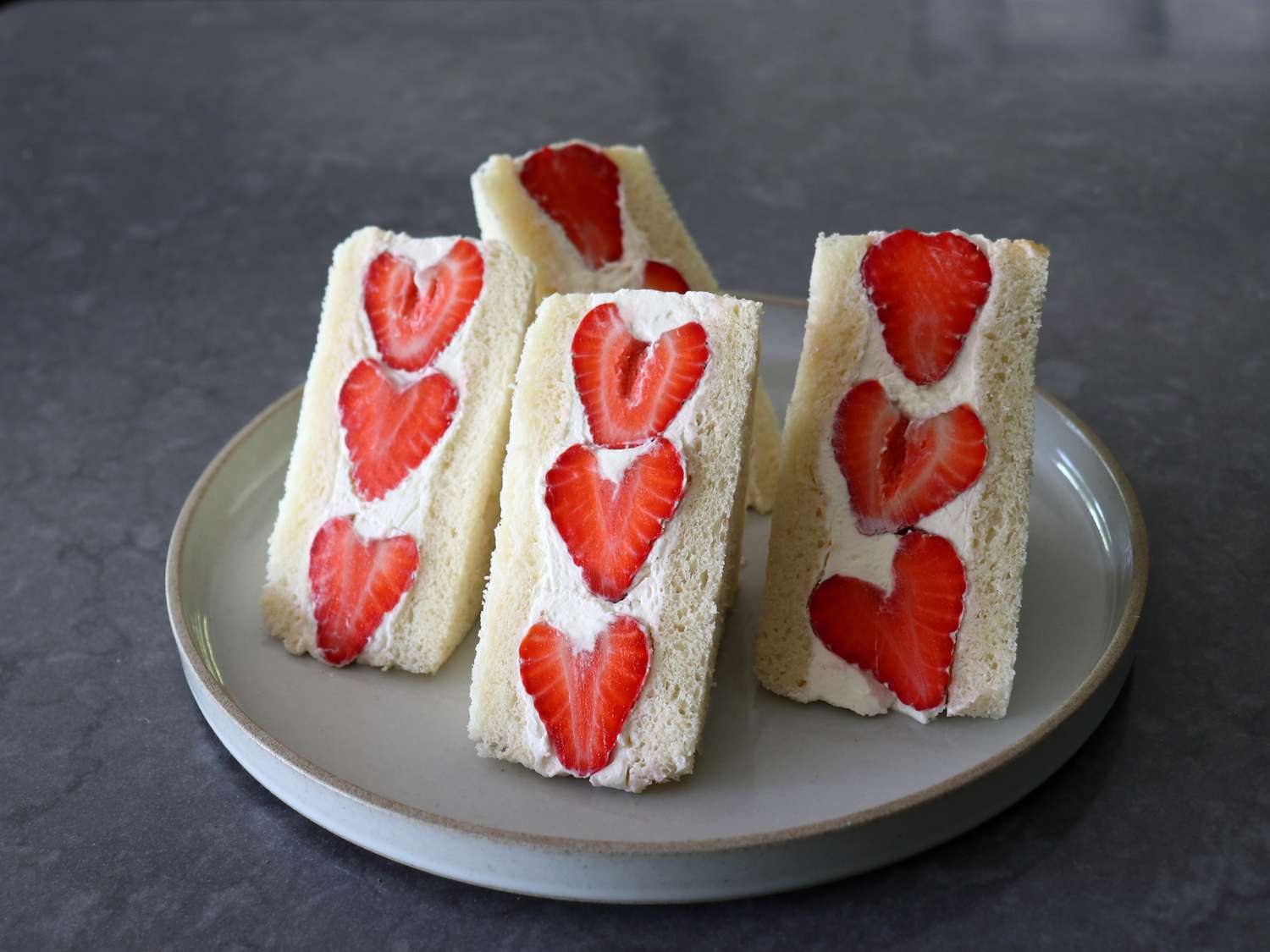 Cut sandos carefully on the diagonal with a serrated knife. For a nicer presentation, use a pairing knife to scrape any excess whipped cream from the cut surface of strawberries, to fill in any gaps, and to reveal their glistening red color underneath. Plate and serve.
