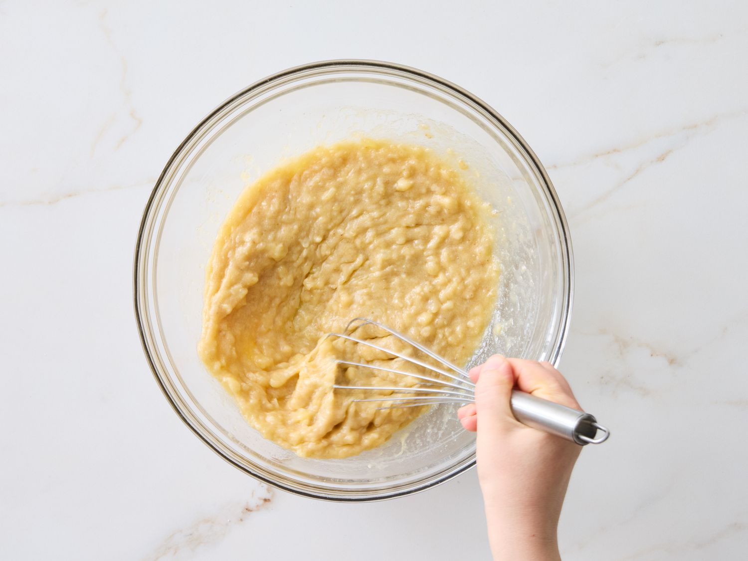 Whisk together bananas, pineapple, white sugar, brown sugar, melted butter, milk, egg, and vanilla in a large bowl.