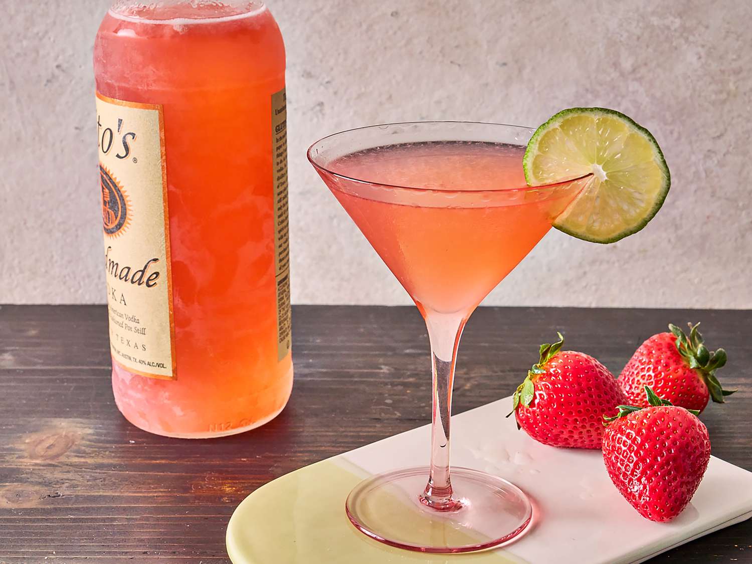 Pour 1 3/4 cups vodka from bottle and reserve for another use. To the remaining vodka, add 1/2 cup cooled strawberry simple syrup, orange liqueur, lime juice, and remaining 1/4 cup water. Seal the bottle and tilt it gently to mix the ingredients.