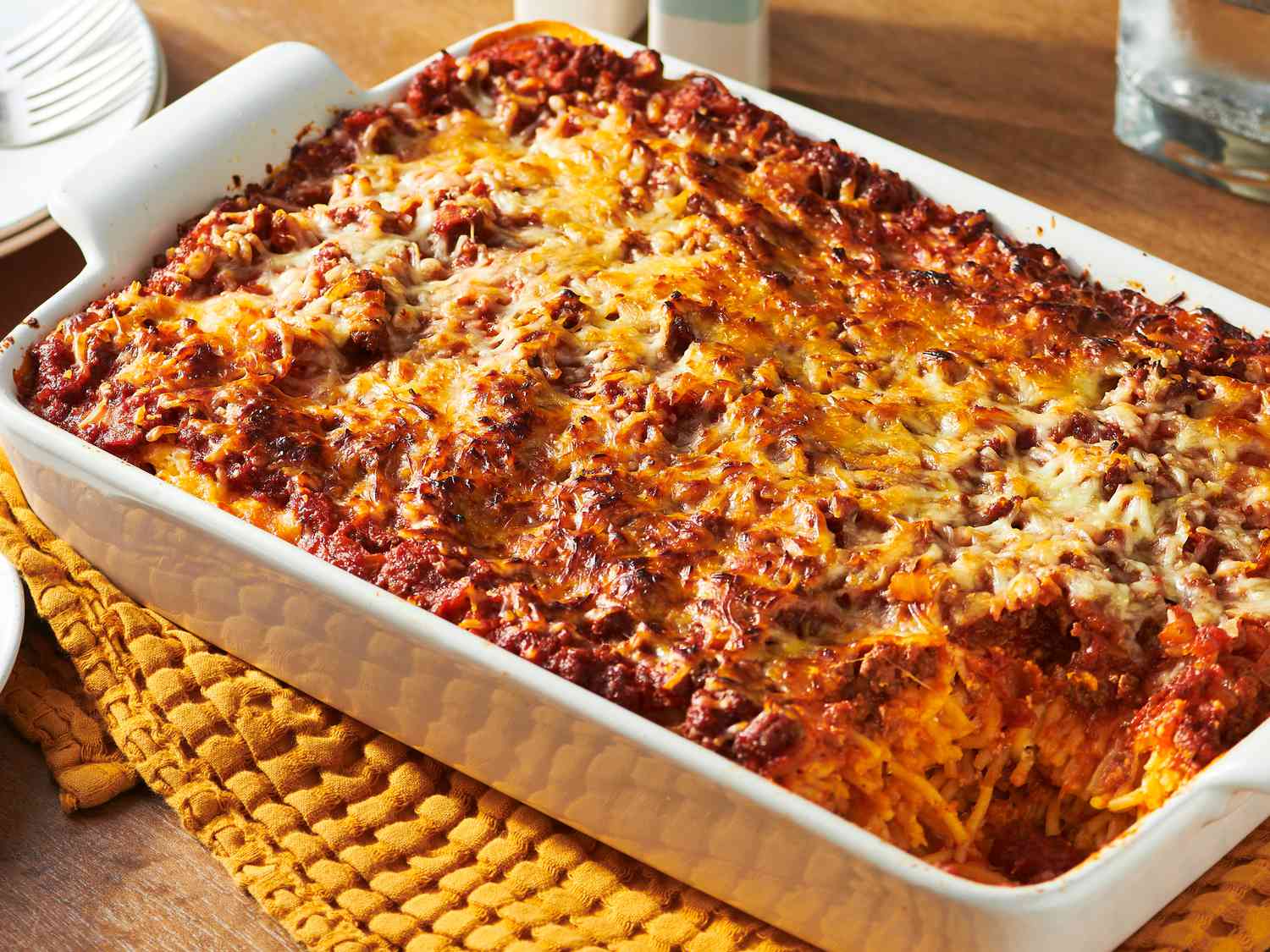 This hearty pasta bake is inspired by “spaghetti day” at the school cafeteria. ”This was exactly like the spaghetti I was served in elementary school in the 'dark ages,'” says reviewer minaayindra. “The only difference is it is not as dry and overcooked! Great, easy recipe, not gourmet but certainly delicious, easily fills you up with a small piece.“